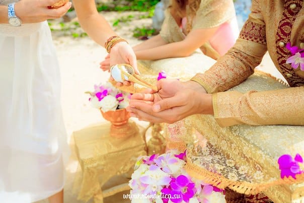 In the afternoon, a ritual is performed on the beach "Rot Nam Song", which is an important part of the Thai wedding ceremony. A silk tent and special furniture for the ceremony are set up on the coast. During the ritual, the couple is seated on special poufs, and each of the guests pours water from a vessel with lotus petals onto their hands in turn, while the guests wish the couple well-being and happiness in their life together.